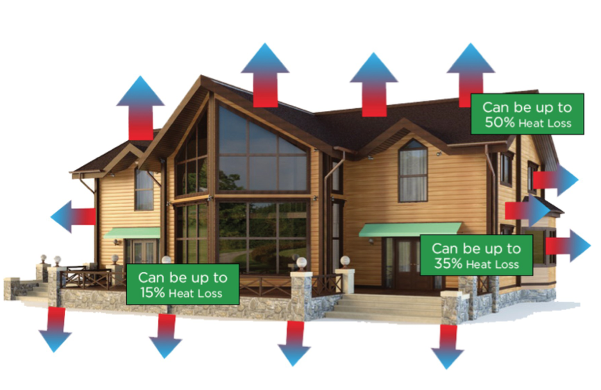Your home loses up to 50% of heat through the roof, 35% through the walls, 15% through the floor, and rest through windows and gaps around the doors.